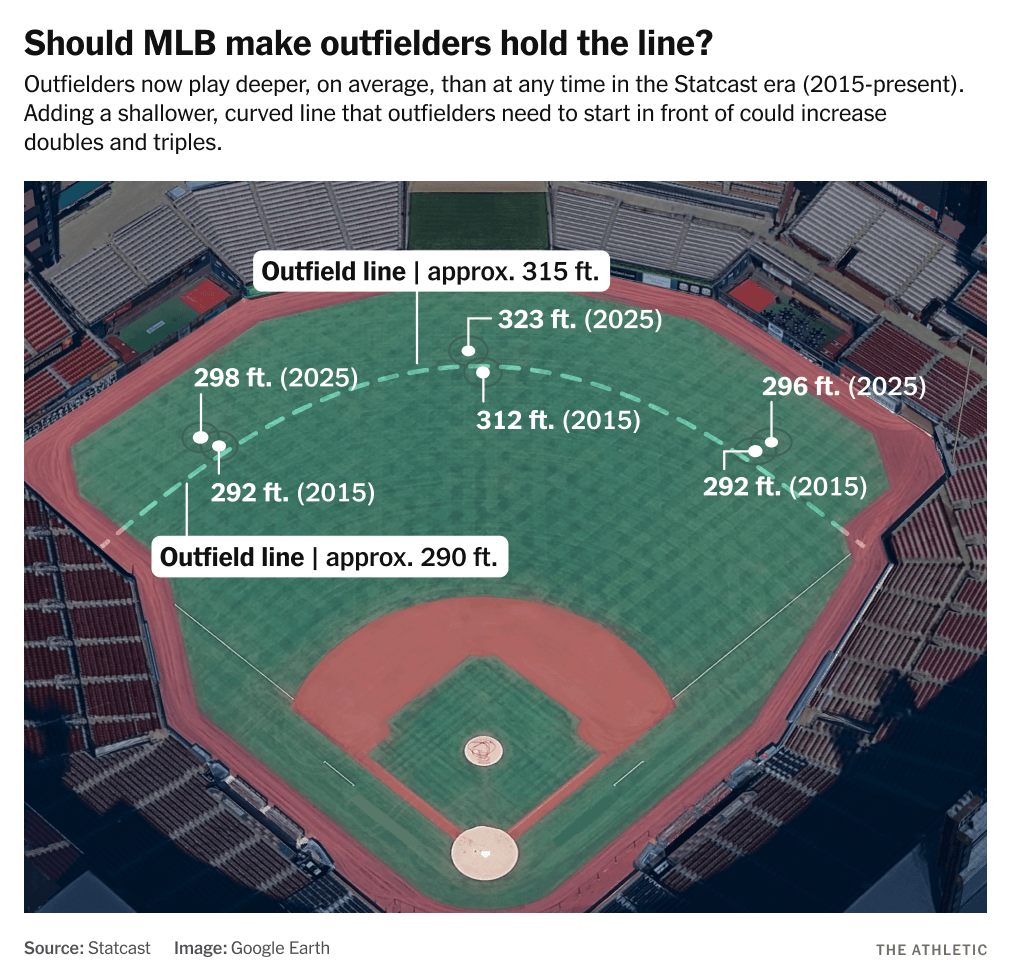 You might have also noticed over the years that MLB outfielders developed a new tick: they doff their caps seemingly before each new opposition at-bat to consult a card hidden inside, telling him where to be. Again, we can thank the spread of intel and the proliferation of game video for giving number crunchers and tendancy-watchers what they need to reveal a hitter’s tendencies. The new interest in outfield positioning and its impact is creating a fear among baseball marketers that fans are being cheated out of the action that makes them buy tickets—the same motivation that led to the banning of the infield shift a few seasons back. Among the potential solutions is a line—cut into the grass or marked by chalk—telling outfielders how deep they can play as an at-bat starts. There’s also talk of even more extreme measures that would tell them where they have to stand before the ball is in play.